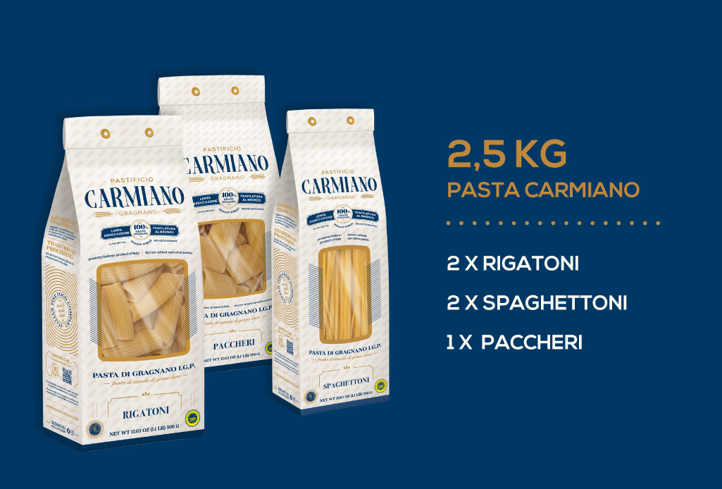 Con la Cuore Vesuviano Box di Pastificio Carmiano puoi portare a tavola tutta la freschezza della tradizione campana: 2,5 kg di Pasta di Gragnano IGP, trafilata al bronzo ed essiccata lentamente, insieme a 2 sughi Cuore Vesuviano artigianali, pronti a esaltare ogni forchettata.