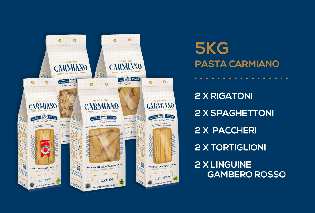 Con la Cuore Vesuviano Box di Pastificio Carmiano puoi portare a tavola tutta la freschezza della tradizione campana: 5 kg di Pasta di Gragnano IGP, trafilata al bronzo ed essiccata lentamente, insieme a 2 sughi Cuore Vesuviano artigianali, pronti a esaltare ogni forchettata.
